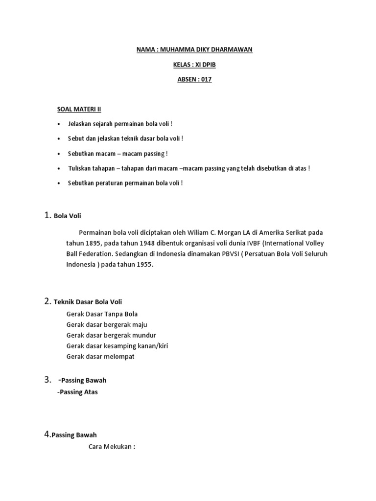 Pengertian servis adalah pukulan awal untuk memulai suatu permainan dalam bola voli, namun saat ini servis tidak hanya dilakukan untuk sekedar menyajikan bola, namun juga menjadi sebuah serangan pertama dari tim yang melakukan servis. Detail sebutkan dua macam passing dalam permainan bola voli pdf dapat kamu nikmati dengan cara klik link download dibawah dengan mudah tanpa iklan yang mengganggu. Behind the back pass dalam permainan bola basket adalah mengoper bola dari belakang. Di passing atas posisi tangan cenderung di tekuk dengan telapak tangan menghadapi ke atas, sedangkan di paling bawah tangan lurus ke depan sedangkan. Namun ada beberapa peraturan hingga teknik dasar bola voli yang harus dipahami sebelum bermain.